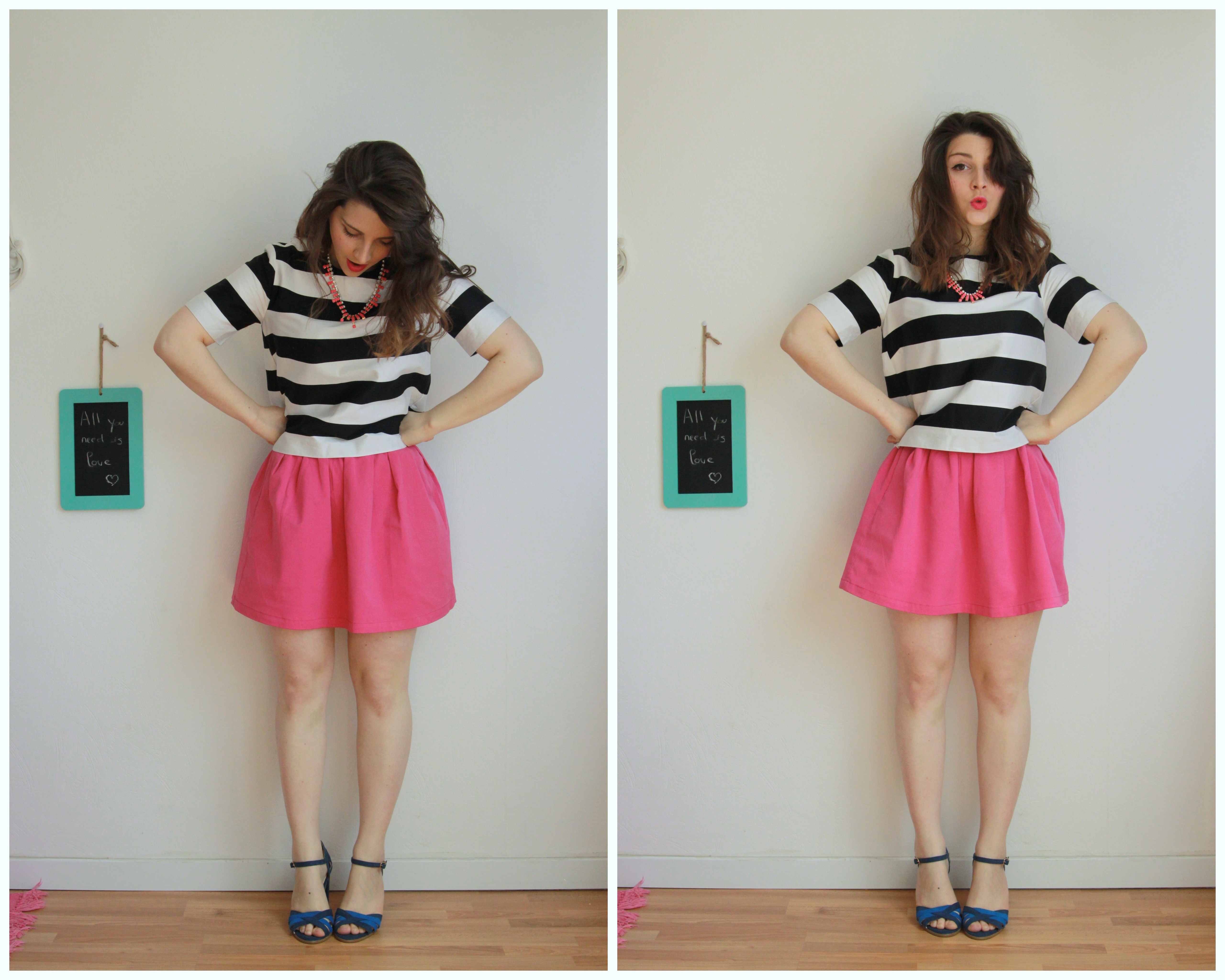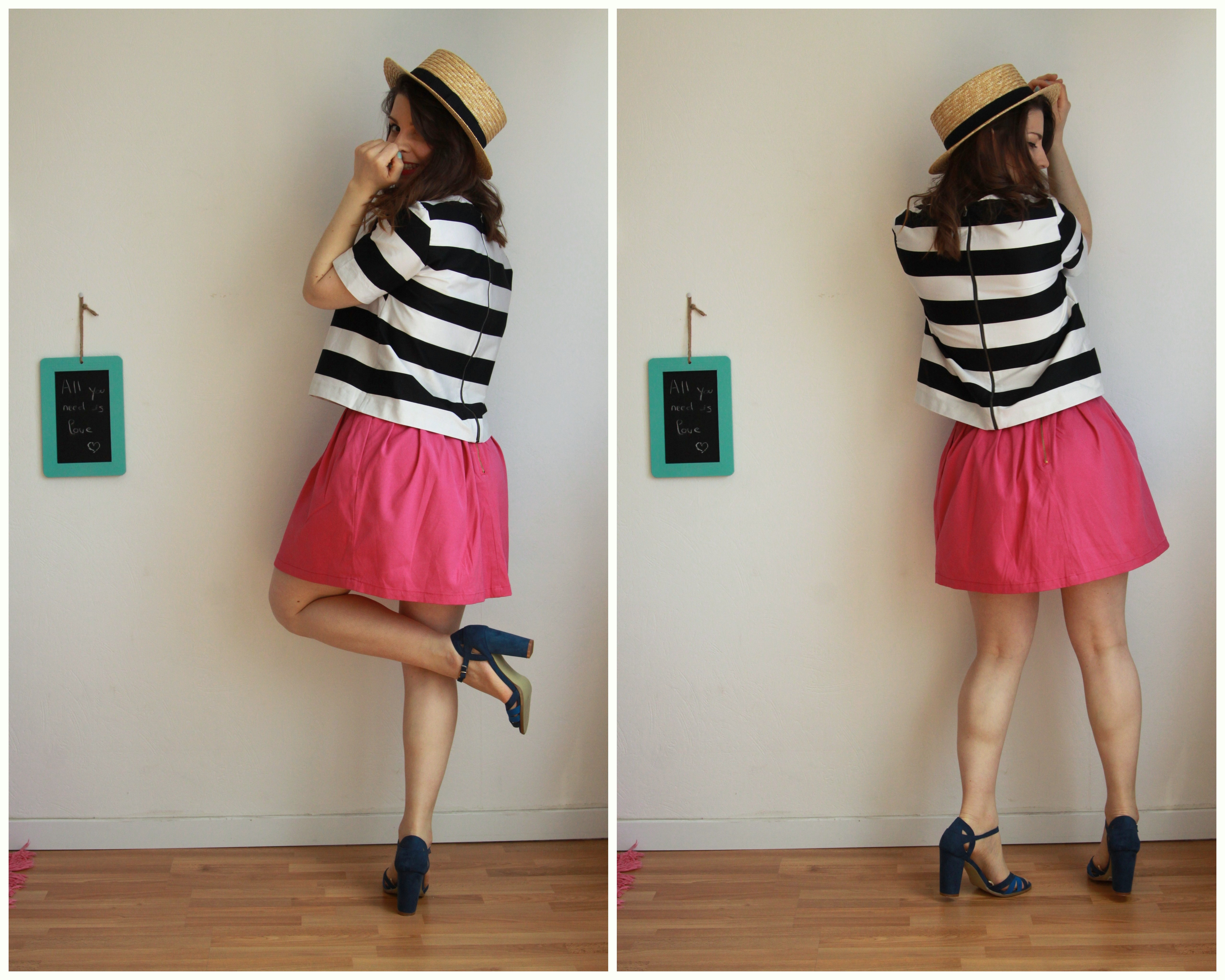 Je porte donc mon top rayé h&m, ma jupe rose Stradivarius et un chapeau style canotier que j’ai retrouvé dans mon armoire, je trouve ce look vraiment dynamisant et ça me rappelle un peu Venise, l’Italie, le soleil… On se sent bien en tout cas en ce mois d’avril.