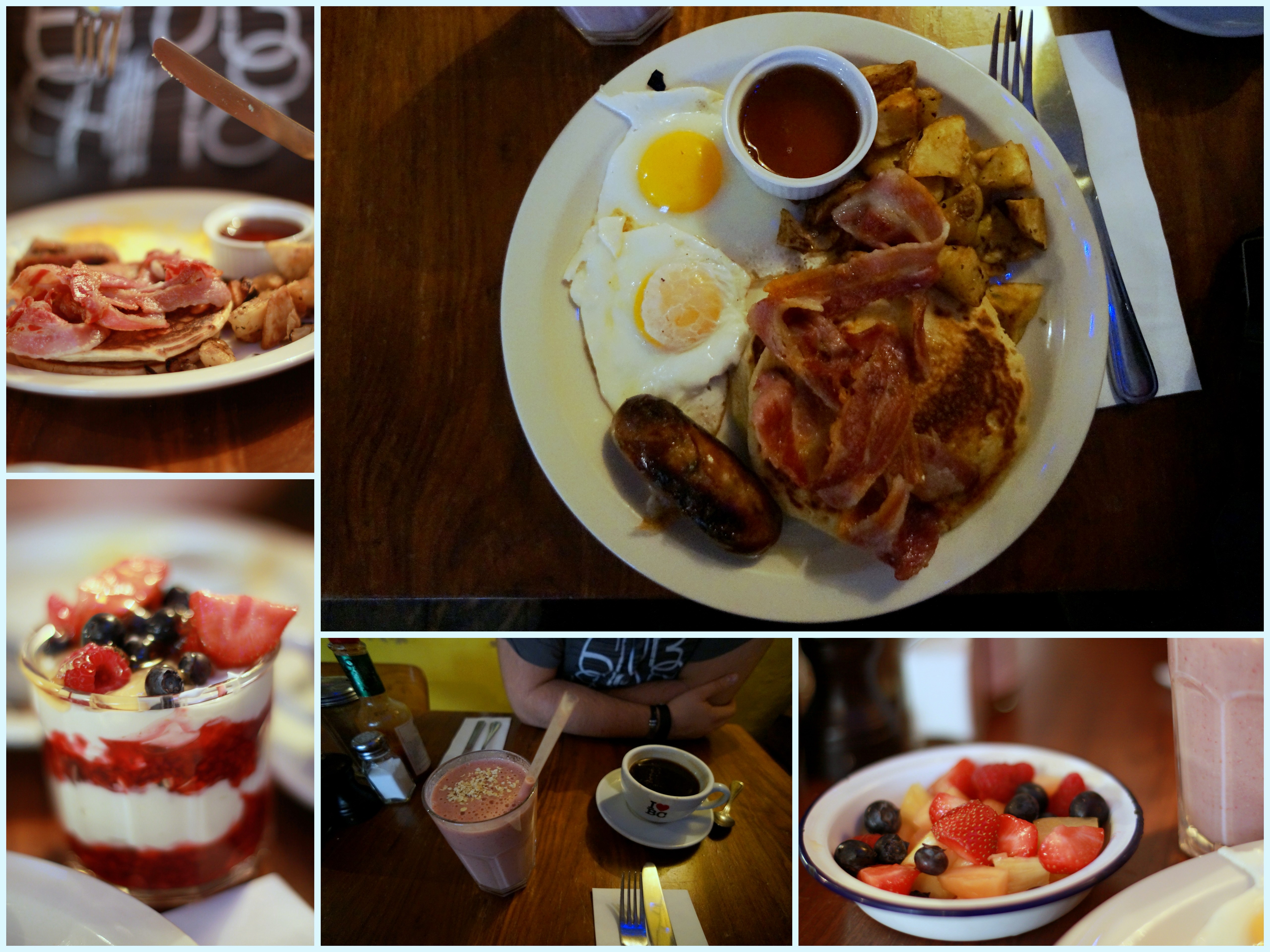 Mon copain et moi commandons la même chose : The all american avec des pancakes, oeufs, saucisses, pomme de terre, bacon et sirop d’érable. Accompagnés d’un smoothie et de quelques fruits pour ma part, et mon copain se commande un café et un yaourt grec, qui se révèle être énorme.