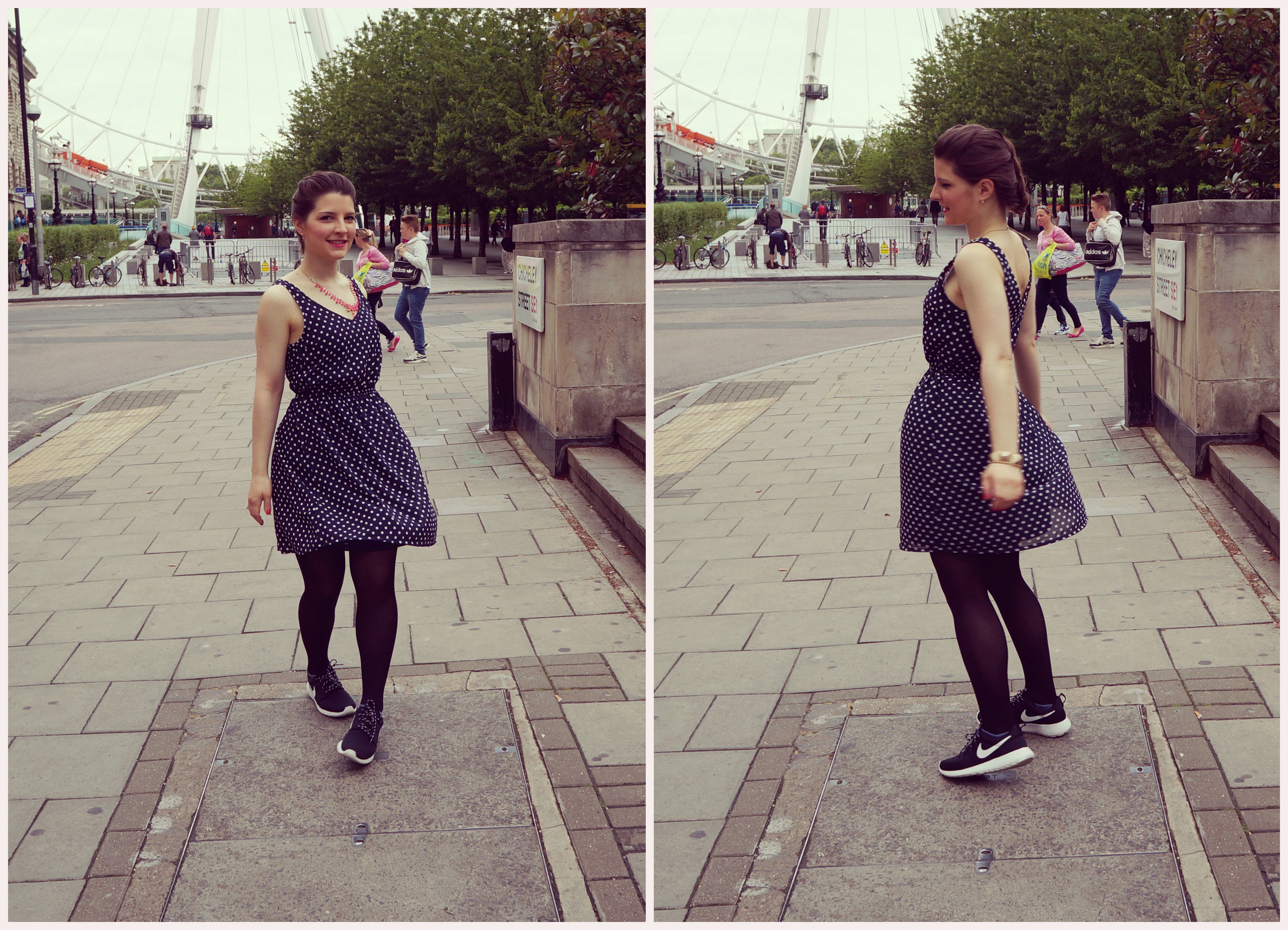 Il y a deux semaines j’étais en vacances à Londres, très loin de cette chaleur caniculaire… Lors de ce séjour, j’ai porté ma robe à pois achetée chez H&M pour ma dernière journée sur place. C’est une robe d’ailleurs qu’on peut porter en été car elle est à fine bretelle. J’en voulais une depuis longtemps et je l’avais trouvé par hasard avant mon départ. Je suis également toujours chaussée de mes Nike Roshe Run avec une moyenne de 12 km à pied par jour lors du séjour.