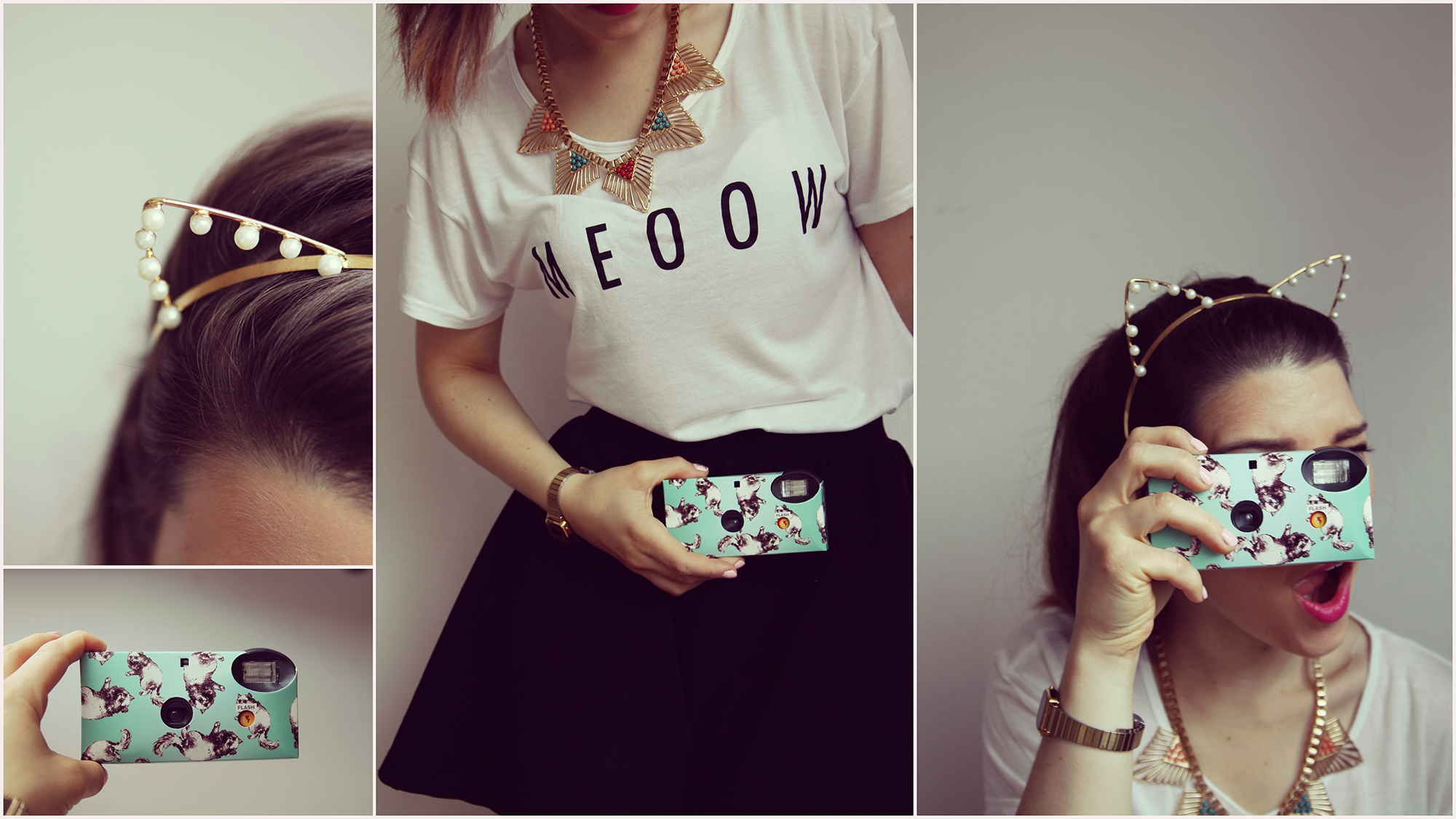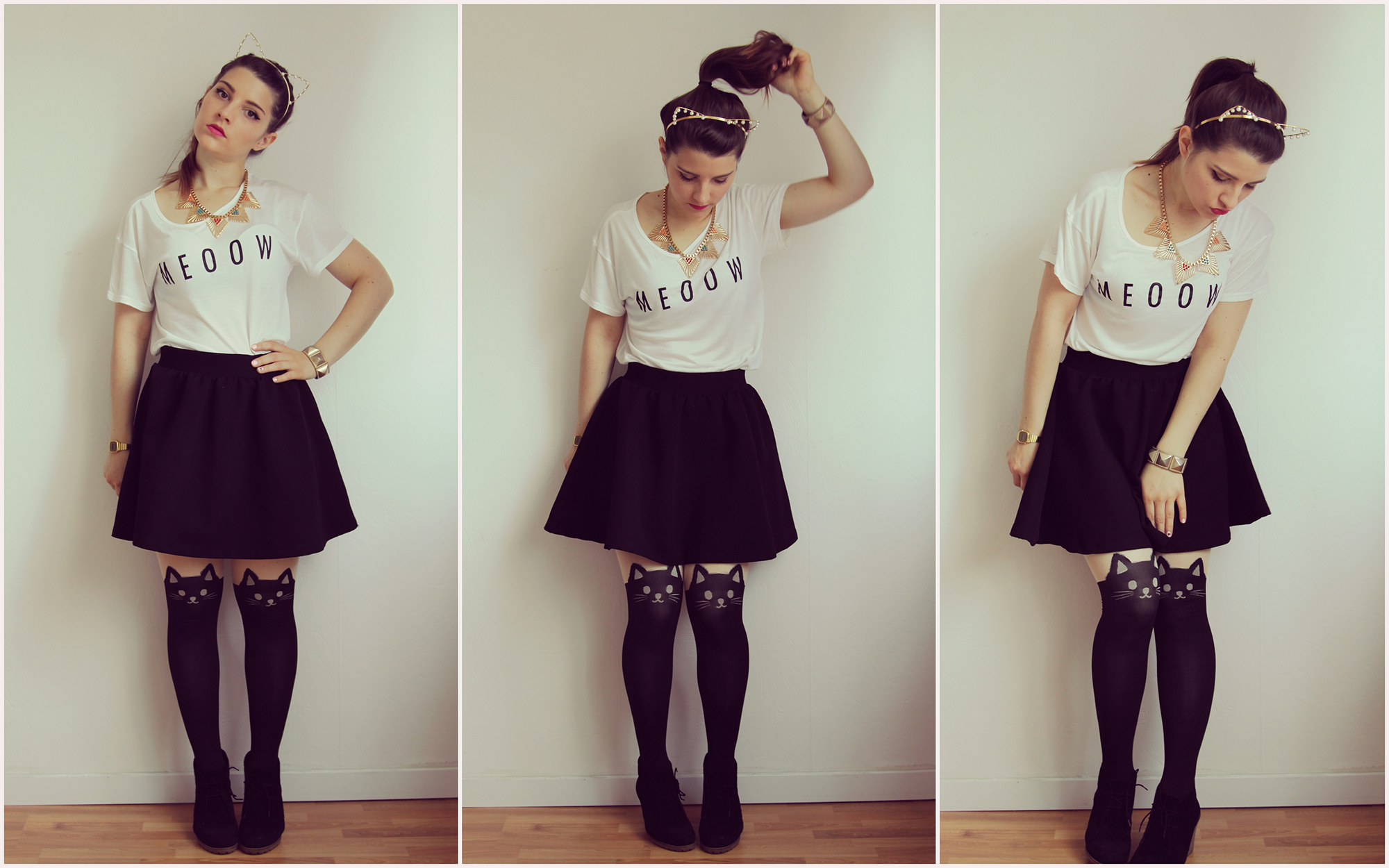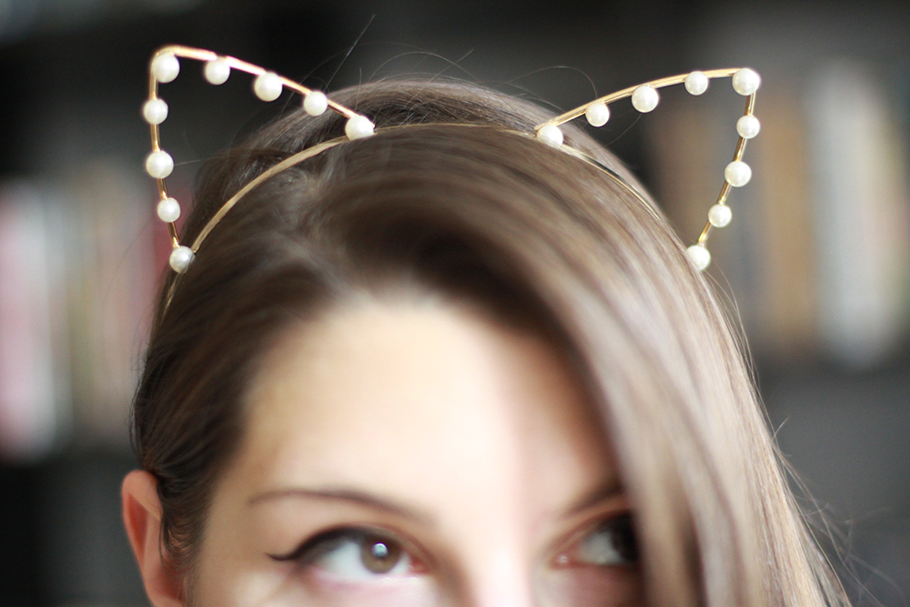 J’avais déjà acheté mon tee shirt Meoow chez H&M, déjà vu ici, et j’ai craqué pour quelques petits accessoires pour compléter ce look, un look qui fait un peu ado certes je le conçois mais qui m’amusait à faire. J’ai surtout craqué pour le serre tête trop mignon avec ces petites oreilles en perle, des stickers pour les ongles à l’éfigie des chatons et des collants avec des têtes de chat. Et pour finir un make up « oeil de chat ».
