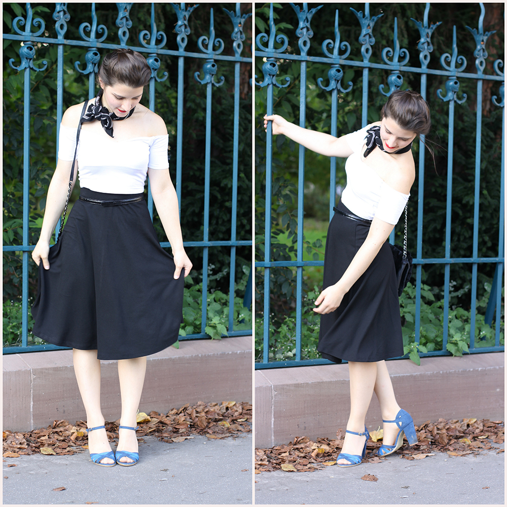 Aujourd’hui je reviens avec un look rétro que je voulais faire depuis longtemps ! J’avais acheté cette jupe midi chez Stradivarius début septembre, la fameuse jupe midi qui est en vogue cette saison. Pour accompagner ce look, j’ai ressorti mon top façon bardot acheté chez Asos, un look qui fait très sage mais qui me transporte dans le temps.