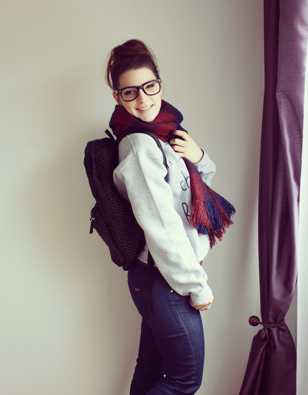 Sweat Rad.co / Jean Zara (old) / Sac Primark / Echarpe New Look (actuellement soldée à 30%) / Nike Roshe Run