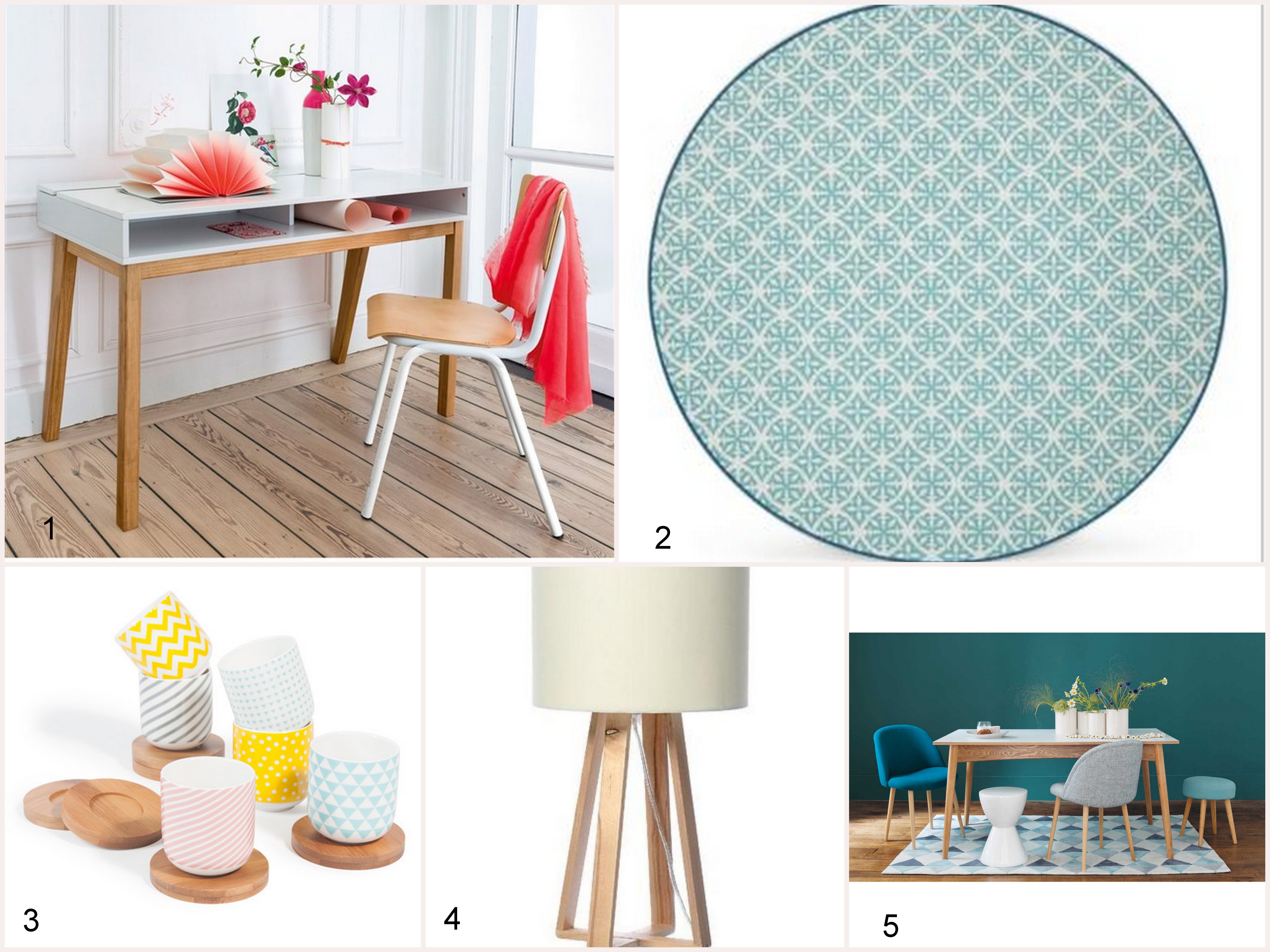 1 Bureau la Redoute / 2 Assiette Alinéa / Service à thé Maison du Monde / 4 Lampe Laredoute / 5 Tapis Maison du Monde