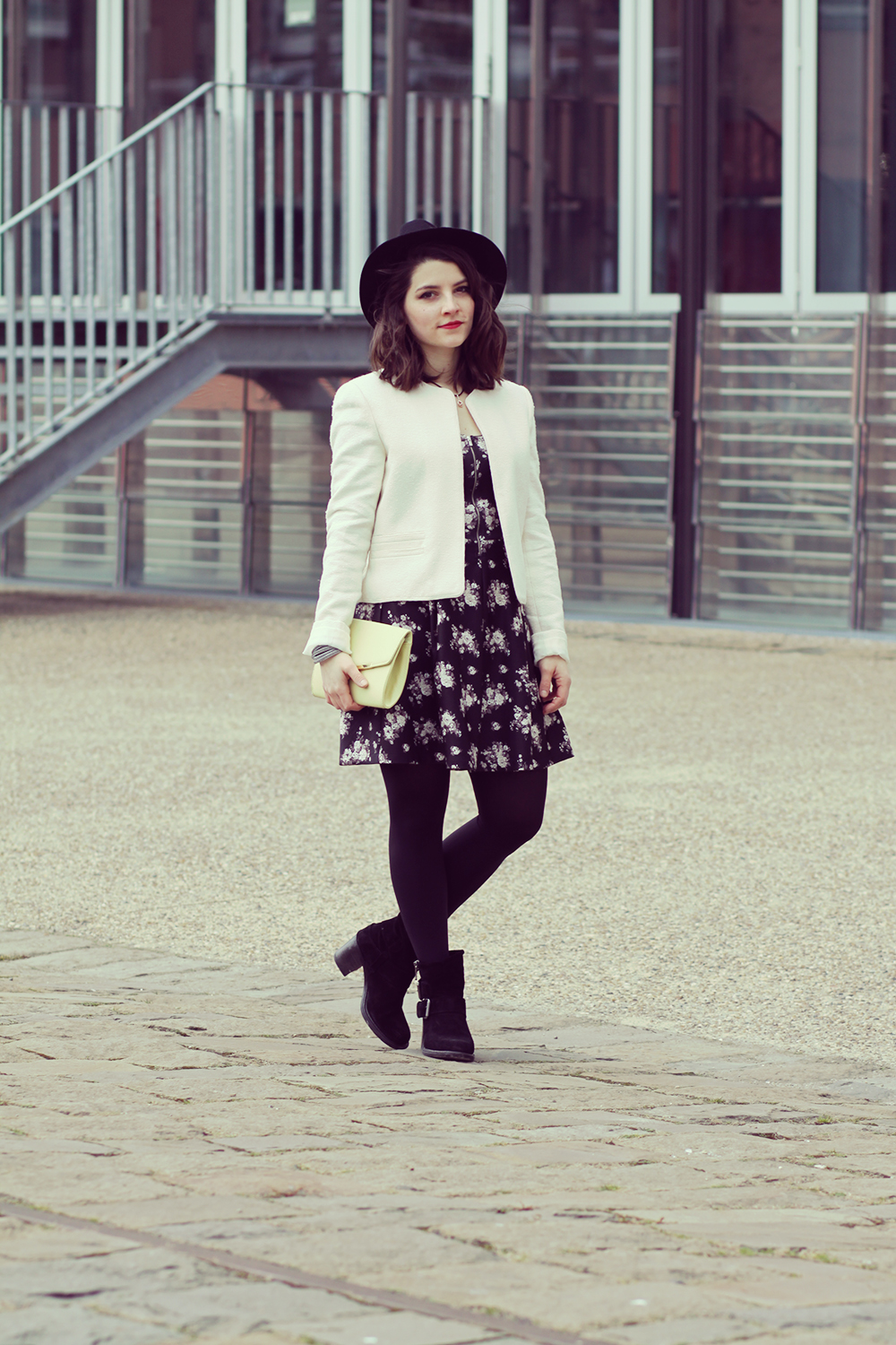Robe Bershka / Veste Mango / Chapeau Pimkie / Pochette Primark / Boots Bata