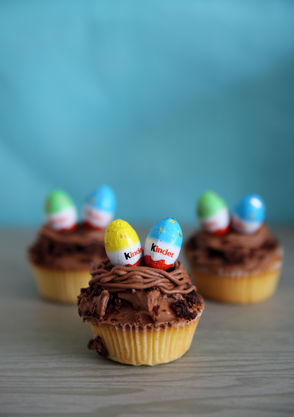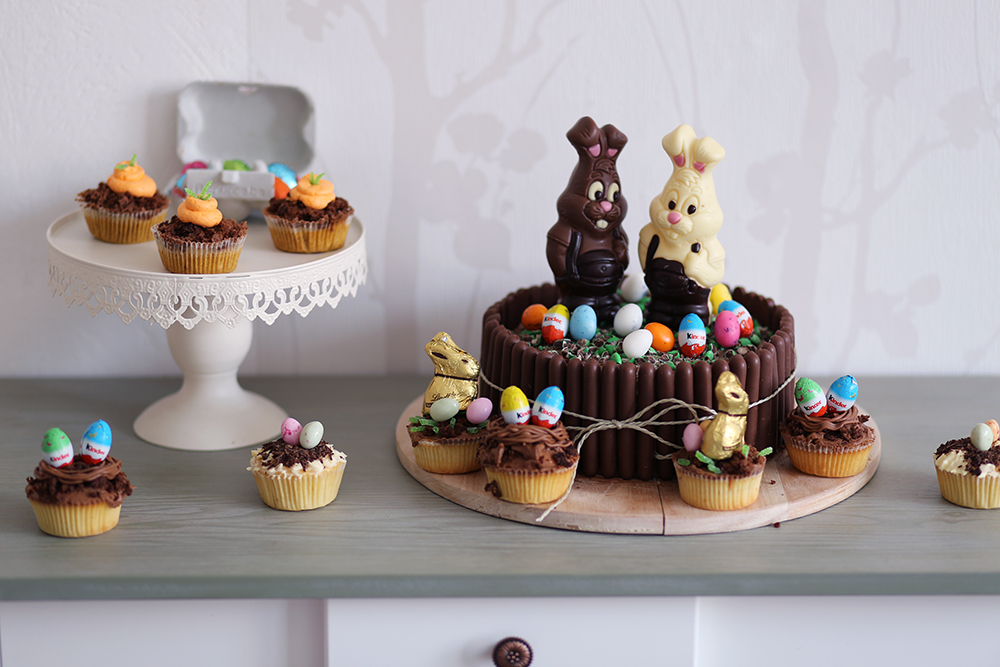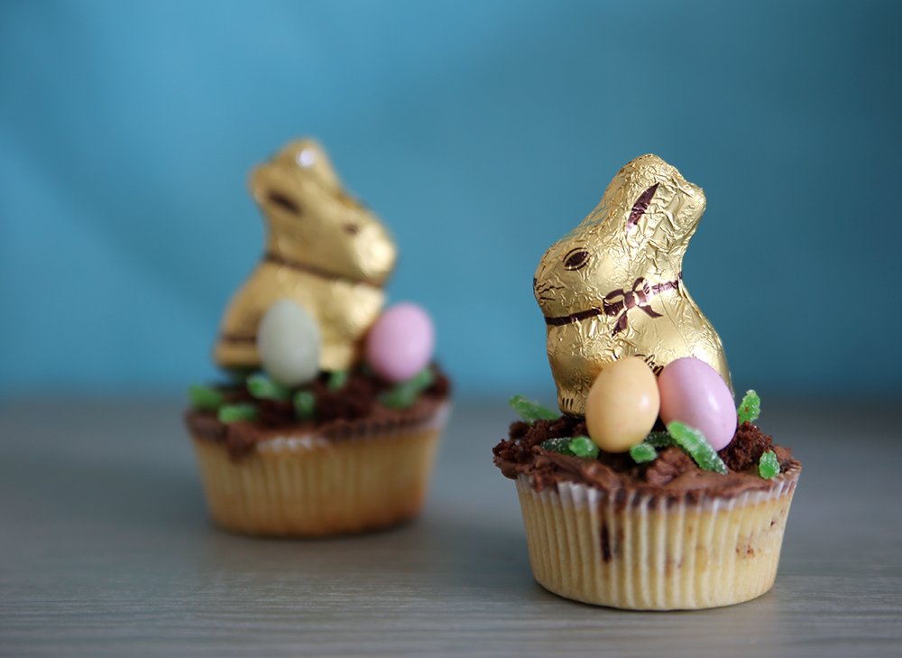 Tout d’abord, étaler une couche de glaçage mascarpone et effriter de la génoise au chocolat dessus. Enfin poser un petit lapin Lindt sur le dessus avec des petits bouts de fils verts pour faire l’herbe.