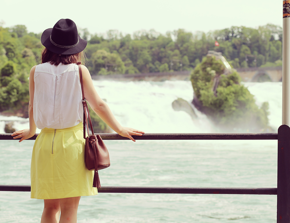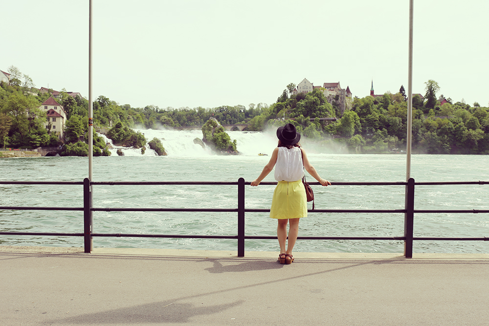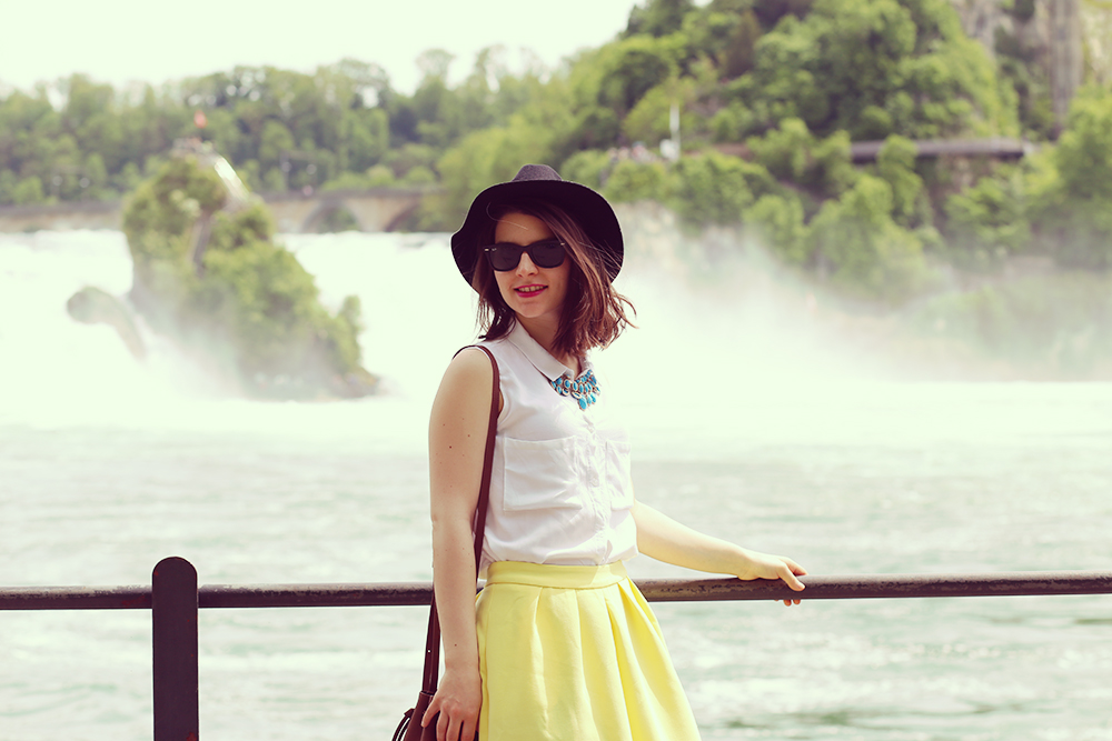 Du coup, on a quand même décidé de partir 2 jours pas trop loin, histoire de dire qu’on est parti. On est allé le premier jour aux Chutes du Rhin en Suisse, on a fait les touristes de base. Il a fait vraiment très beau, et j’ai porté une tenue d’été. Pour cette tenue Sunny, c’est cette jupe de chez Stradivarius qui fait vraiment la différence, en temps normal je n’aime pas trop le jaune, mais cette saison j’ai craqué sur cette couleur qui met de bonne humeur.