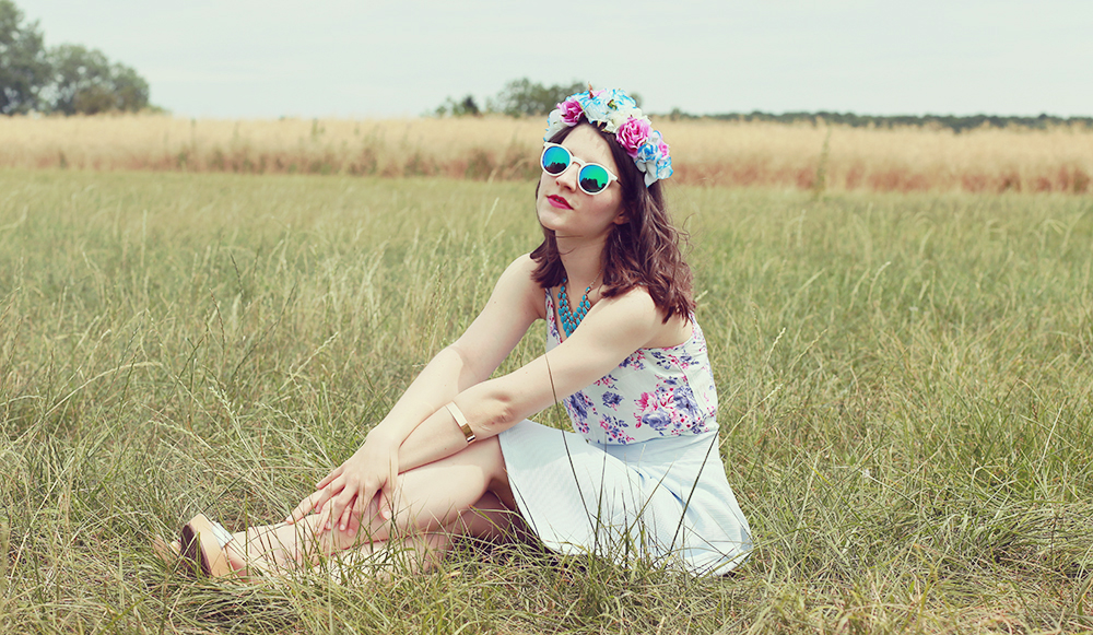 Combishort H&M / Veste Boohoo / Jupe Pimkie / Chaussures Pimkie / Couronne de fleurs Claire’s / Collier H&M / Lunettes Promod