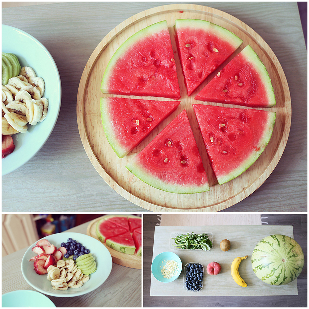 Découper le kiwi et la banane en rondelles, la pêche en morceaux (on peut bien sûr prendre d’autres fruits), et les déposer sur la tranche de pastèque. Ajouter des feuilles de basilic ou de menthe pour la déco, les myrtilles (ou du raisin noir en guise d’olive) et parsemer de copeaux de chocolat blanc pour en faire le gruyère.
