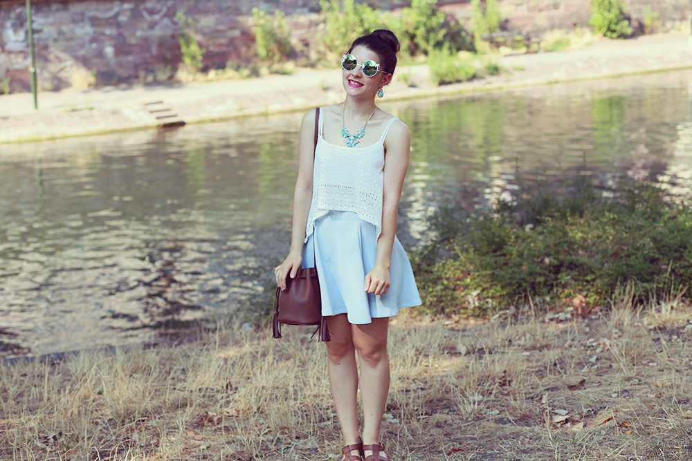 C’est un look assez simple : un top blanc trouvé en soldes en Allemagne chez Bershka, une jupe bleue de chez Pimkie que vous avez déjà vu ici, les lunettes les plus cool du monde, et mes chaussures adorées de chez New Look que vous verrez certainement pour la dernière fois parce que je les ai cassées samedi dernier…