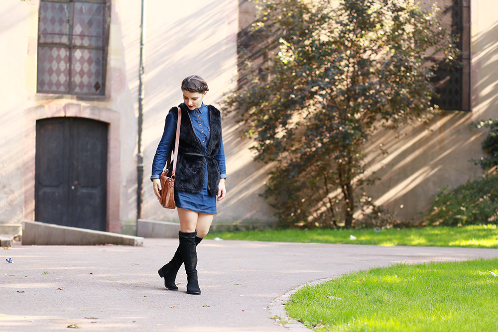Je porte ma robe/chemise en jean que vous avez vu dans mon précédent look, mais que je porte cette fois comme une robe.