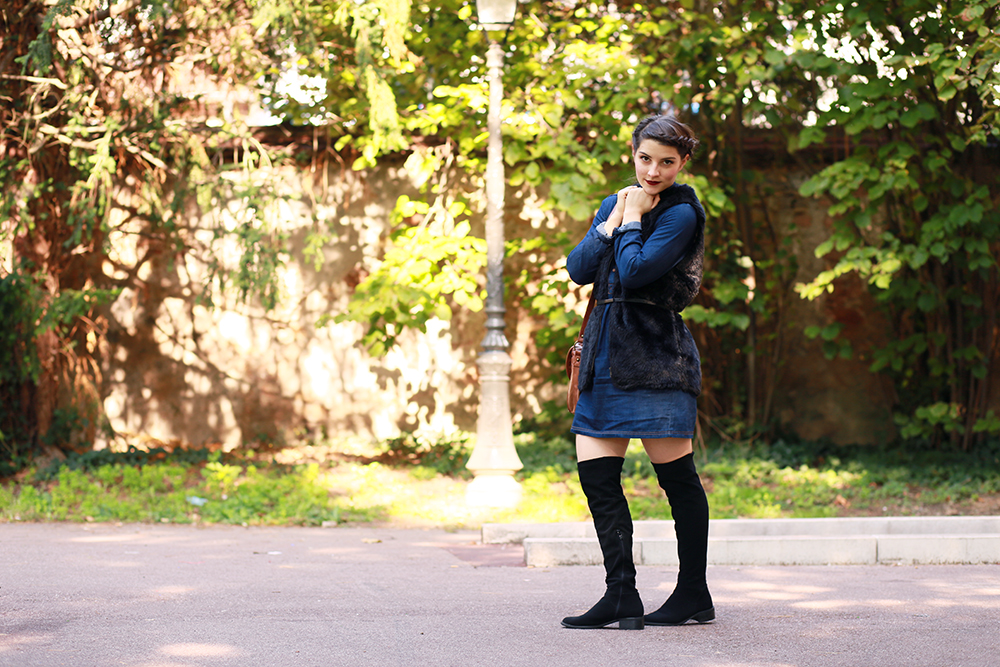J’ai également ressorti des bottes hautes pour ce look, qui sont en réalité des cuissardes mais comme je suis petite je trouve qu’elles me vont mieux portées en dessous du genoux donc je les ai retroussées comme sur les photos ci-dessus.