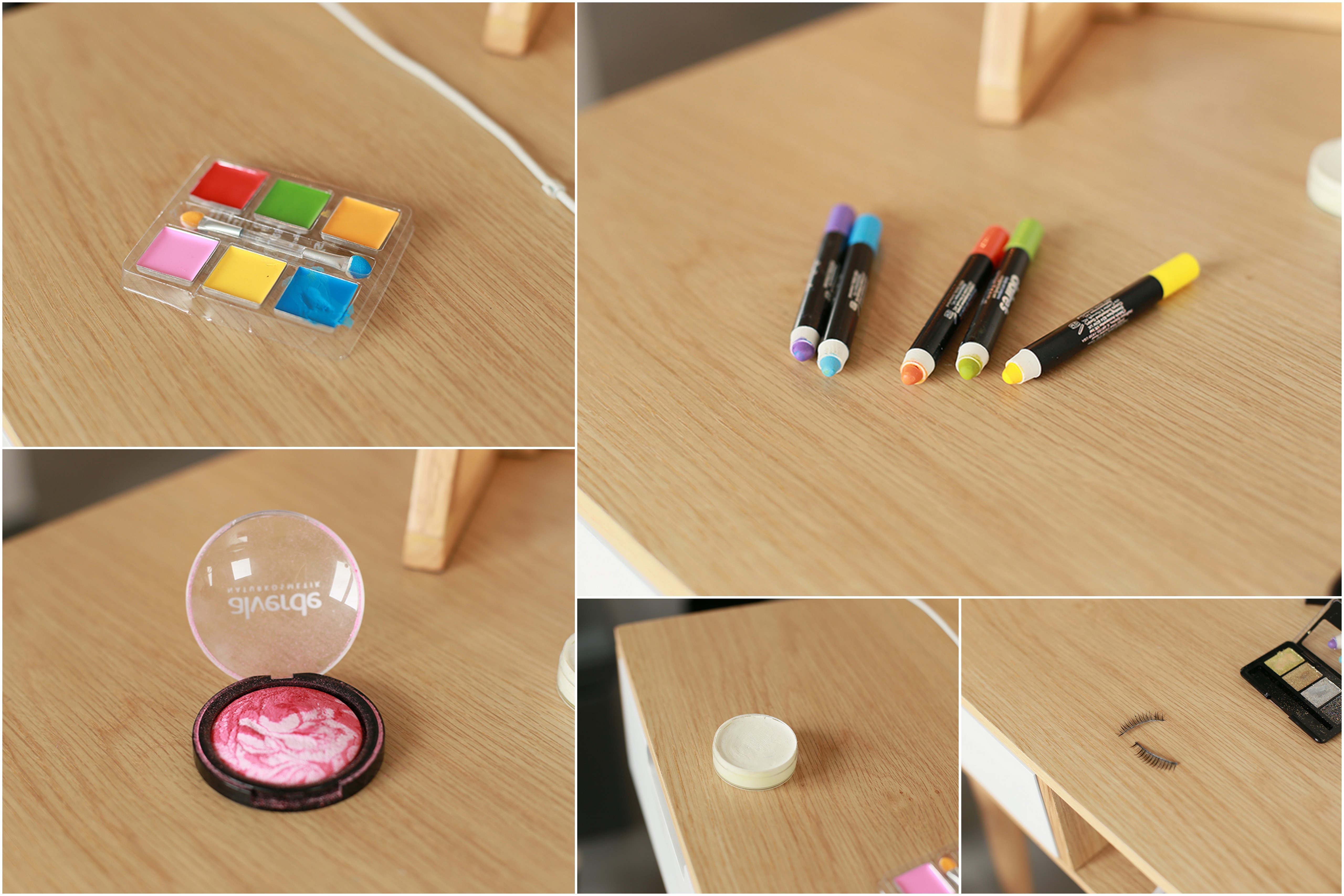 1. du maquillage coloré adapté au visage pour réaliser l’arc-en-ciel, j’ai trouvé une palette et des crayons chez Claire’s,